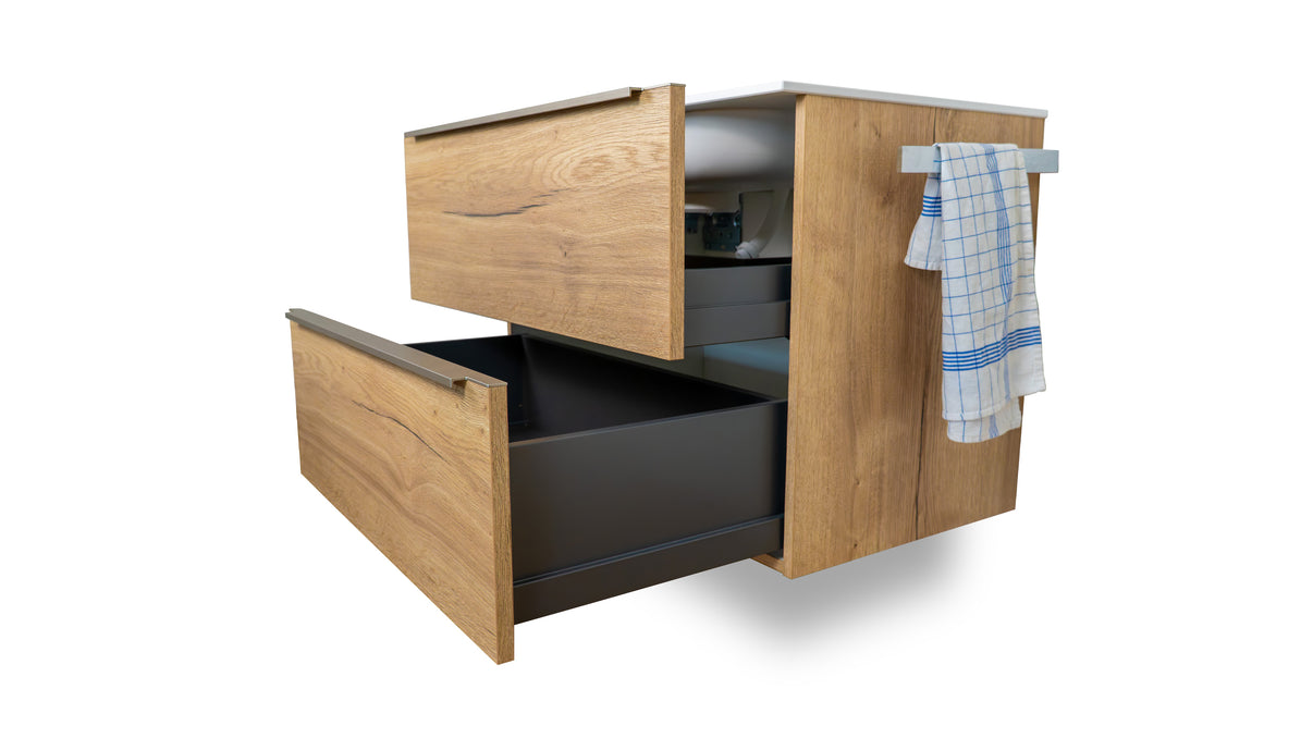 Die hochwertigen Auszüge bieten großzügigen Stauraum für Handtücher, Pflegeprodukte und Badutensilien. Dank der pflegeleichten Melaminoberflächen in Eiche natur oder klassisch Weiß bleibt die Front langlebig, kratzfest und leicht zu reinigen.