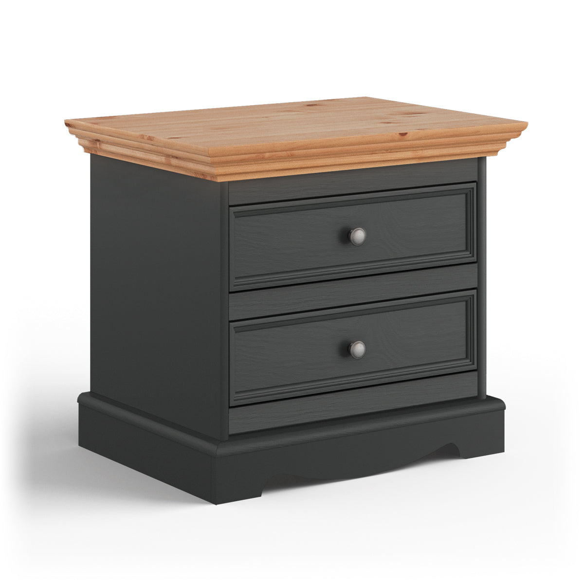 Der Bologna Elegante Nachttisch in Graphit mit einer natürlichen Kiefernholzplatte ist die perfekte Ergänzung für ein rustikales, klassisches oder provenzalisches Schlafzimmer. Sein zeitloses Design mit dekorativen Fräsungen und eleganten Metallgriffen macht ihn zu einem stilvollen Highlight neben dem Bett.