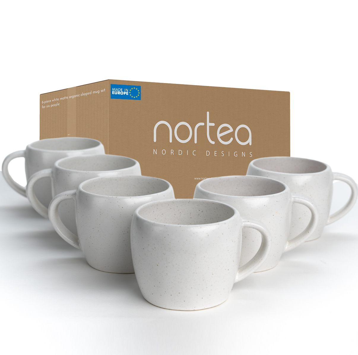 nortea – nordisches Design Steingut Kaffeetassen Set, 6-teilig (350 ml), mit organischen Formen, in modernem Weiß-Matt, nachhaltig hergestellt in Portugal